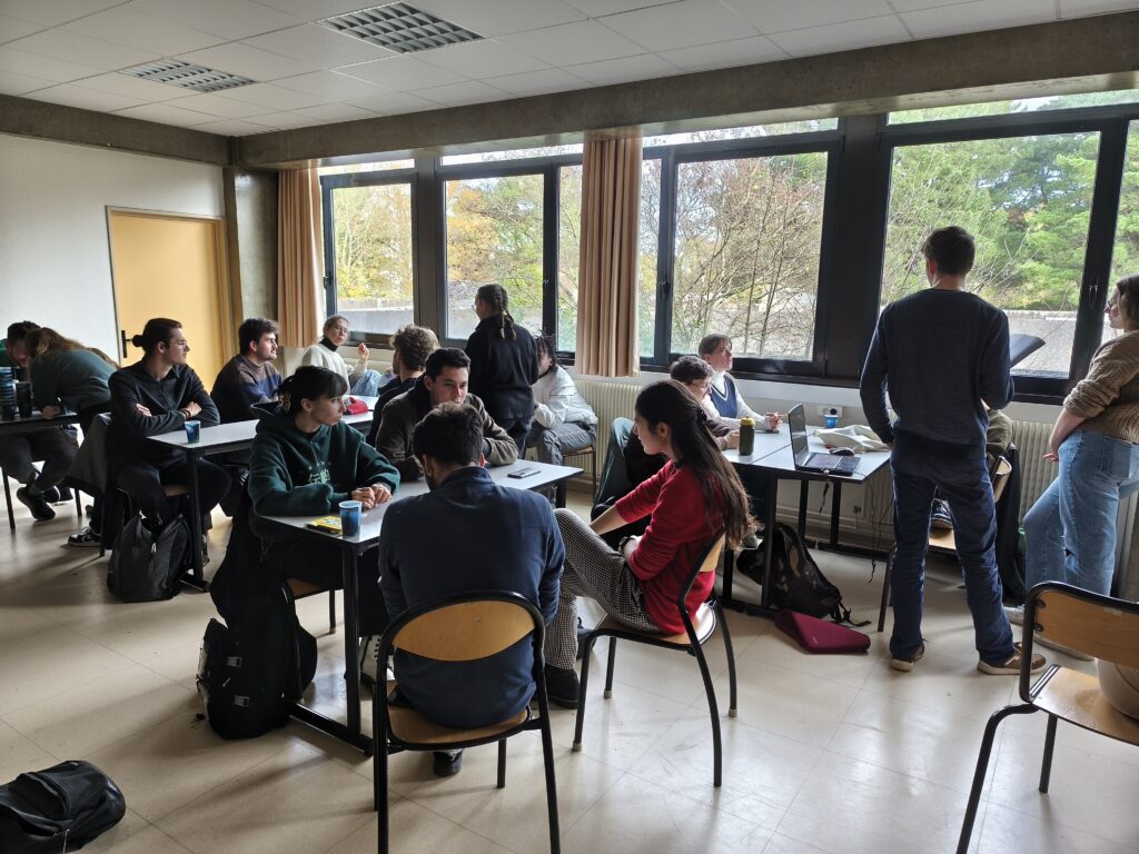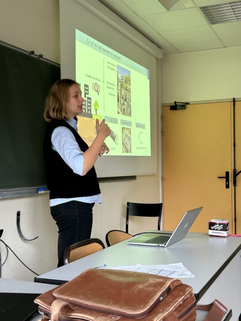Après un accueil café permettant aux différents groupes d’étudiant de se retrouver, l’enseignante-chercheuse Laure VIDAL-BEAUDET a présenté l’Institut Agro, et notamment l’unité EPHor (Environnement Physique de la plante Horticole), unité de recherche propre à l’Institut Agro qui se consacre aux interactions entre le végétal et son environnement (sol et atmosphère) dans un contexte urbain. C’est cette unité qui a contribué au programme DESSERT pour « DEsimperméabilisation des Sols, Services Ecosystémiques et Résilience des Territoires » mené par Plante&Cité, un projet ayant permis de mieux comprendre les questions de descellement des sols urbains. Deux doctorants ont ensuite présenté leur sujet de thèse respectifs, sur la sélection d’arbres adaptés aux environnements urbains par un dispositif multi-espèce (Pierre PARPAY VAUCELLES), et sur l’impact des opérations de renaturation des cours d’école sur le climat urbain (Cloé DEWITTE). Cette dernière s’inscrit d’ailleurs dans le cadre du projet de désimperméabilisation et végétalisation des cours d’école mené par Nantes Terre Atlantique.