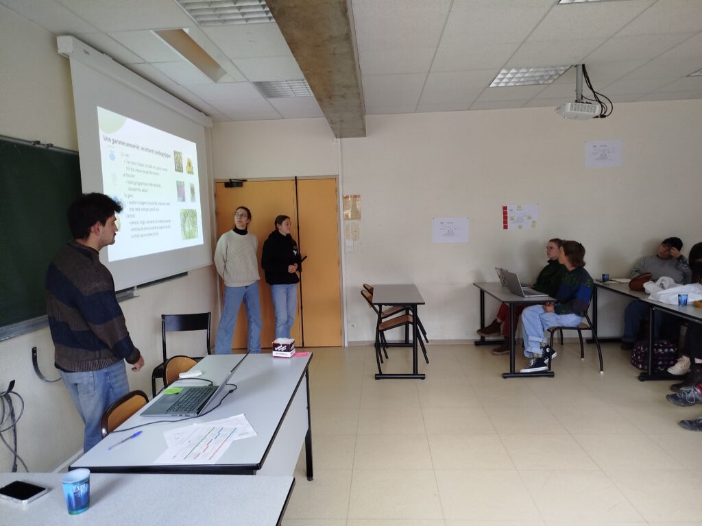 Un temps d’échange a ensuite été consacré au projet de reconception des cours de l’école des Dervallières à Nantes, dont la concertation des usagers et la conception est menée par le groupe d’étudiants ingénieurs d’Angers, et la gamme végétale élaborée par les BTS2. Les ingénieurs ont remis en contexte le projet en réalisant un compte rendu de leur visite des deux cours au mois d’octobre avant de laisser la parole au BTS qui par groupe de travail ont présenté leur proposition d’une palette végétale adaptée à un public de jeunes enfants, requérant un entretien raisonnable pour les agents de l’école, mais laissant également transparaître leurs appétences respectives (propositions de gammes sensorielles, maraîchères ou locales). Leur travail servira de base pour les ingénieurs dans la conception du projet de réaménagement.