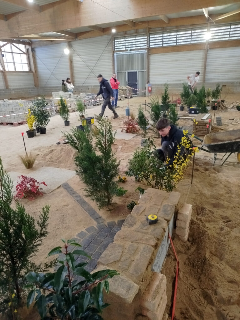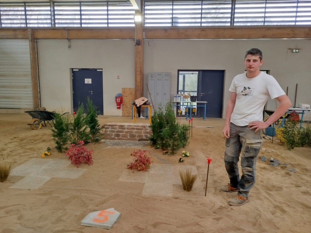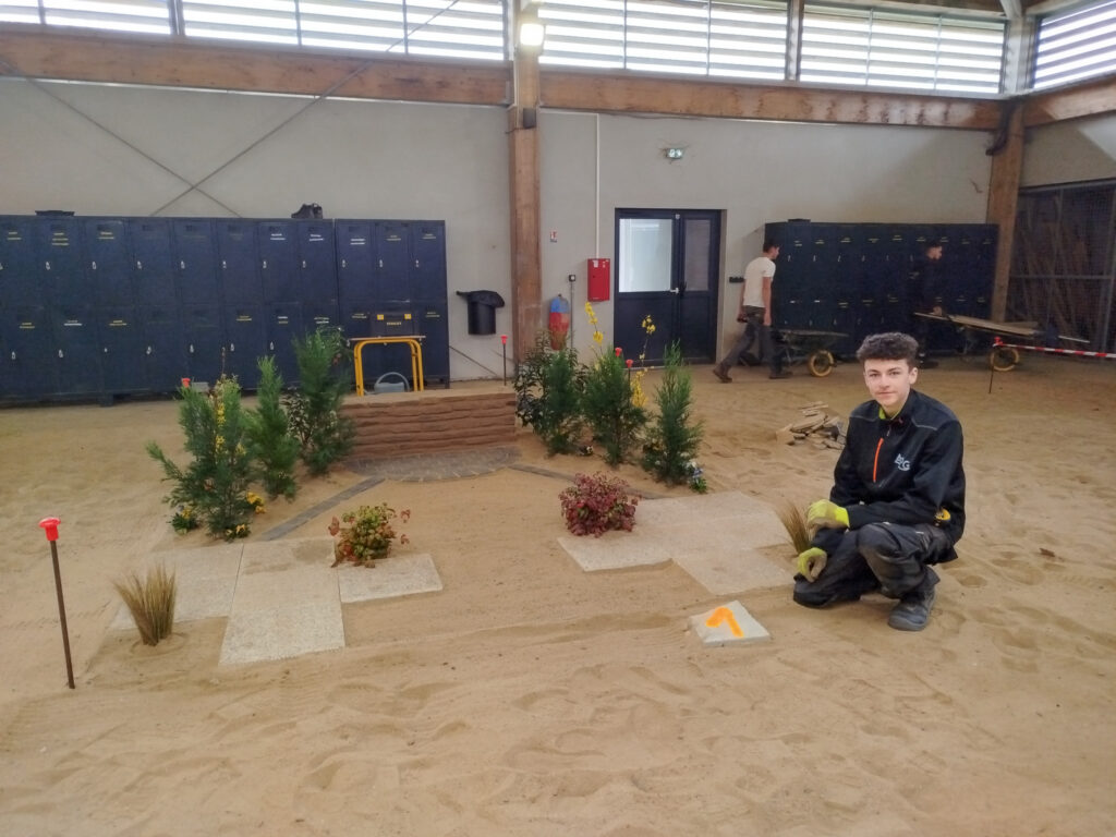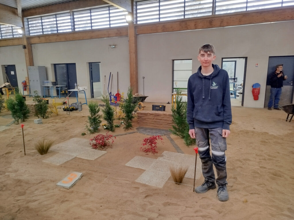 Les apprentis volontaires en Aménagements paysagers disposaient de 8h pour travailler sur une construction paysagère, à partir d’un plan édité à l’avance par les MOF – Meilleurs Ouvriers de France. Cela permet aux candidats de se préparer en amont s’ils le souhaitent. En plus de la construction paysagère, ils avaient une épreuve de reconnaissance des végétaux et un questionnement technique.